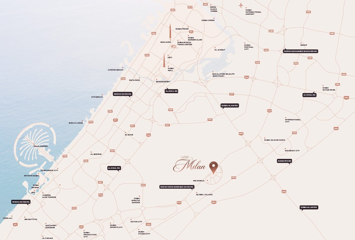 Perfectly positioned in one of Dubai’s most dynamic districts, Azizi Milan offers strategic connectivity to key locations such as IMG Worlds of Adventure, Global Village, Dubai International Airport and Al-Maktoum International Airport.